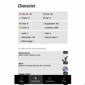 Designed for homebrew TTRPGs, the combat system uses dice from d4 to d12 to determine the character class. For example, Knight(d4) items may trigger on the die roll of 1 making their effect frequent for d4 character, while being sub-optimal for classes that use greater dice.