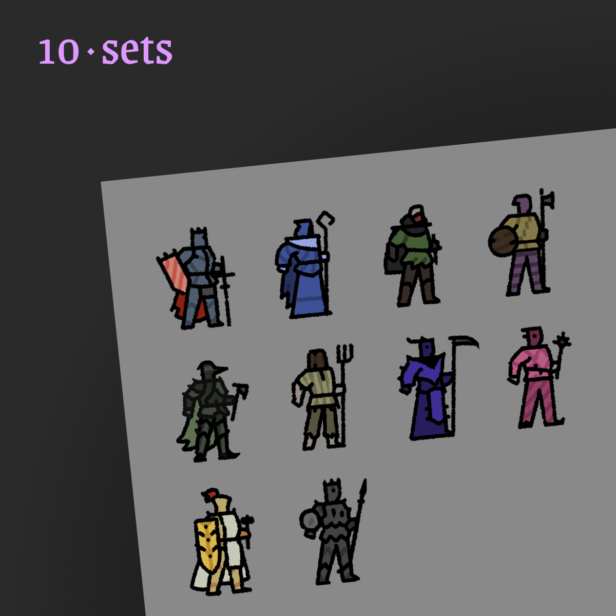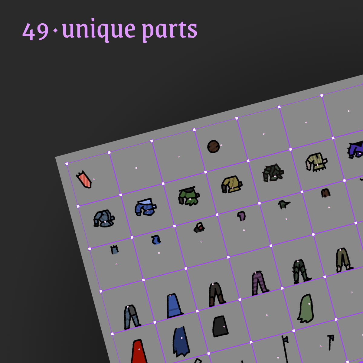 A set of 2d assets that you can combine to make unique variations of a static fantasy character. Intended to be used for a 2d game prototyping. To create a character, overlay a part of each type (leg, head, torso etc) on top of one another.